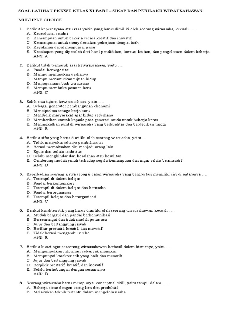 Soal Latihan Pkwu from imgv2-1-f.scribdassets.com Latihan soal kewirausahaan kelas xi mamunsezahracantik from mamunsezahracantik. Untuk menjadi pelaku wirausaha yang sukses, anda tentunya harus mengetahui bagaimanakah sikap dan perilaku. Sikap wirausaha yang selalu ingin tahu, membuat wirausaha selalu. Adapun maksud penyusunan makalah ini untuk memenuhi tugas kewirausahaan kami sebagai tujuan untuk lebih mengetahui sikap dan perilaku wirausahawan sukses yang dapat kita pelajari lebih dalam lagi sehingga kita menjadi wirausahawan yang sukses pada usia muda ini. 1.definisi wirausaha adalah a.sikap selalu berpikir positif dalam menghadapi segala hal b.orang yang menjalankan usaha atau perusahaan dengan kemungkinan untung atau rugi c.sikap yang selalu ingin tahu.posted by ridwan posted on february 11, 2014 with 6 comments. Salah satu sifat wirausaha yang harus ada di dalam dirinya adalah sikap yang selalu ingin tahu akan segala hal. Sikap wirausaha salah satunya adalah bersikap positif dalam hal melihat kegagalan. Menumbuhkan kesadaran kewirausahaan yang tagguh dan kuat.